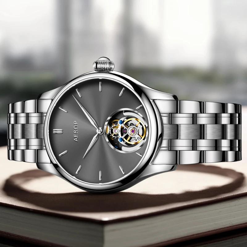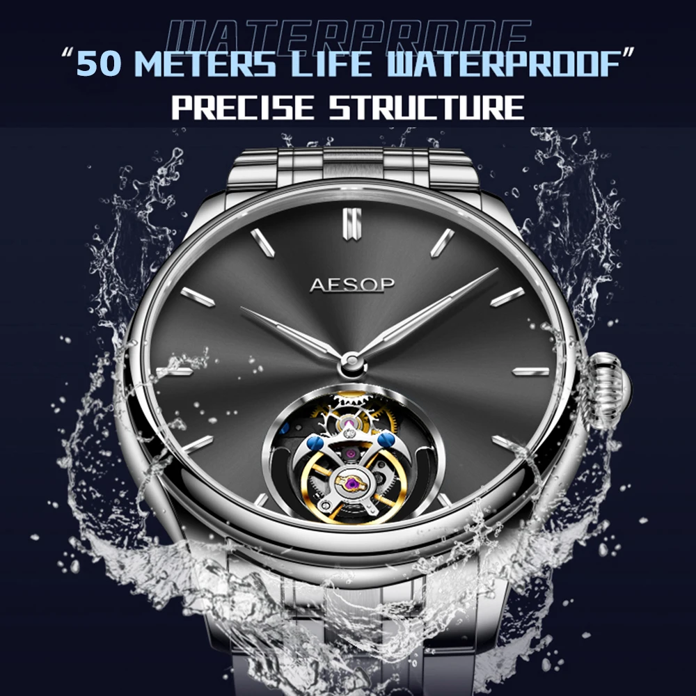 AESOP Flying Tourbillon Mechanical Watch For Men Sapphire Waterproof Manual Tourbillon Mens Skeleton Watch Luxury Steel Strap A