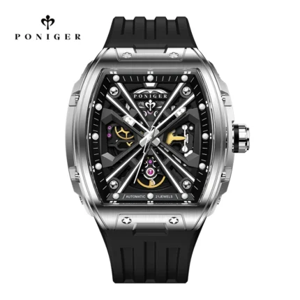 Poniger Men’s Watch Mechanical Tonneau Square Fashion Luxury Wrist Rubber Band Stainless Steel